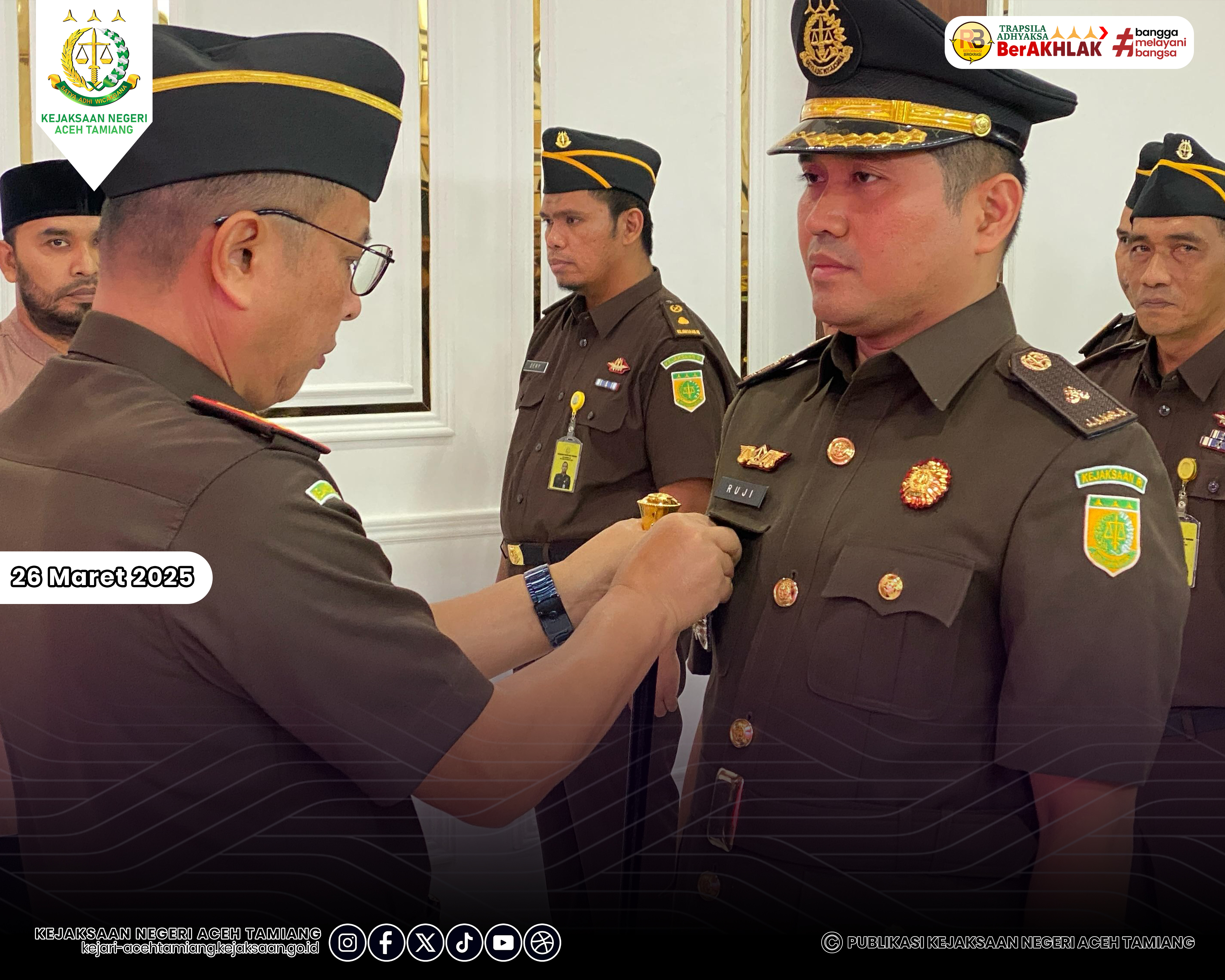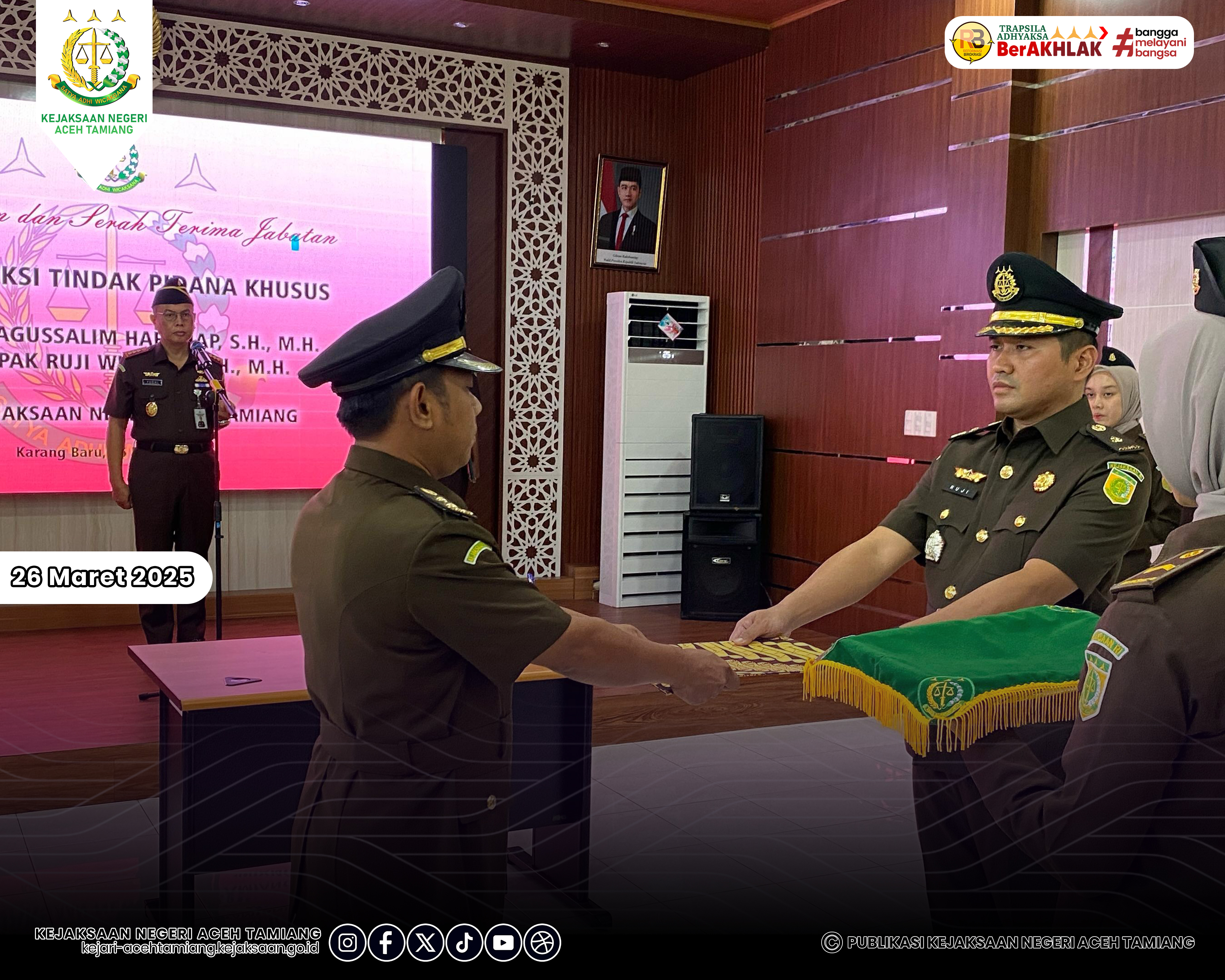 [Rabu, 26 Maret 2025] Bertempat di Aula Kantor Kejaksaan Negeri Aceh Tamiang, Kepala Kejaksaan Negeri Aceh Tamiang, Bapak Dr. Yudhi Syufriadi, S.H., M.H. Melantik Bapak Ruji Wibowo, S.H., M.H. Menggantikan Bapak Agussalim Harahap, S.H., M.H., Sebagai Kepala Seksi Tindak Pidana Khusus Kejaksaan Negeri Aceh Tamiang.