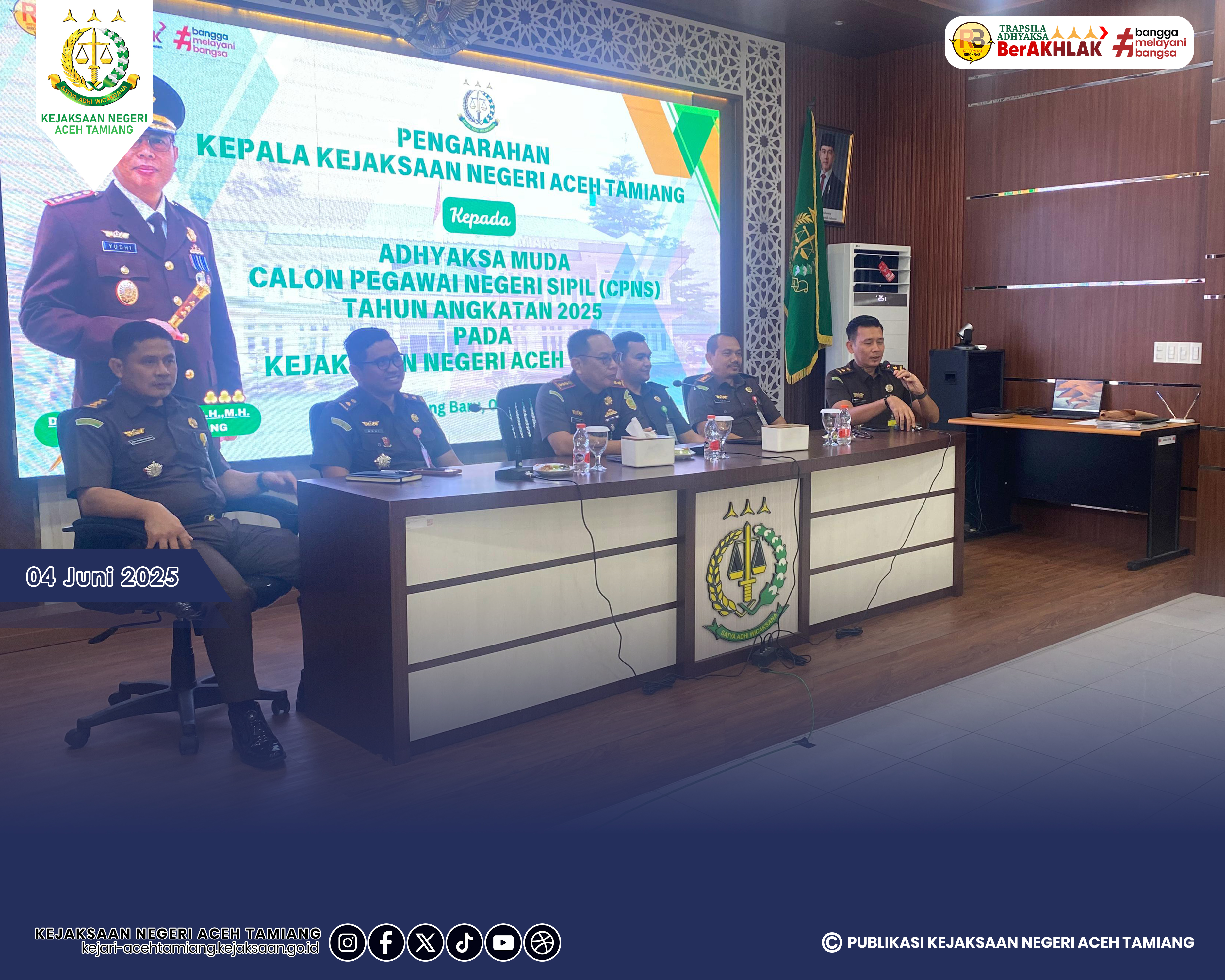 Rabu, 04 Juni 2025. Kepala Kejaksaan Negeri Aceh Tamiang, Bapak Dr. Yudhi Syufriadi, S.H.,M.H. Beserta Jajaran laksanakan pengarahan terhadap 14 orang CPNS Angkatan 2025 di Aula Kantor Kejaksaan Negeri Aceh Tamiang.
