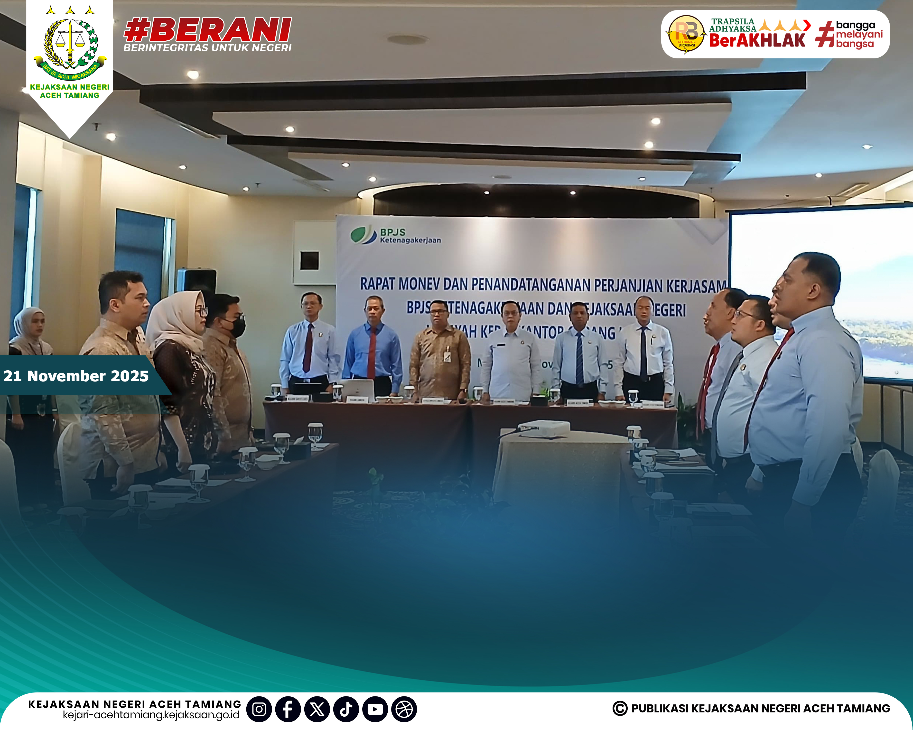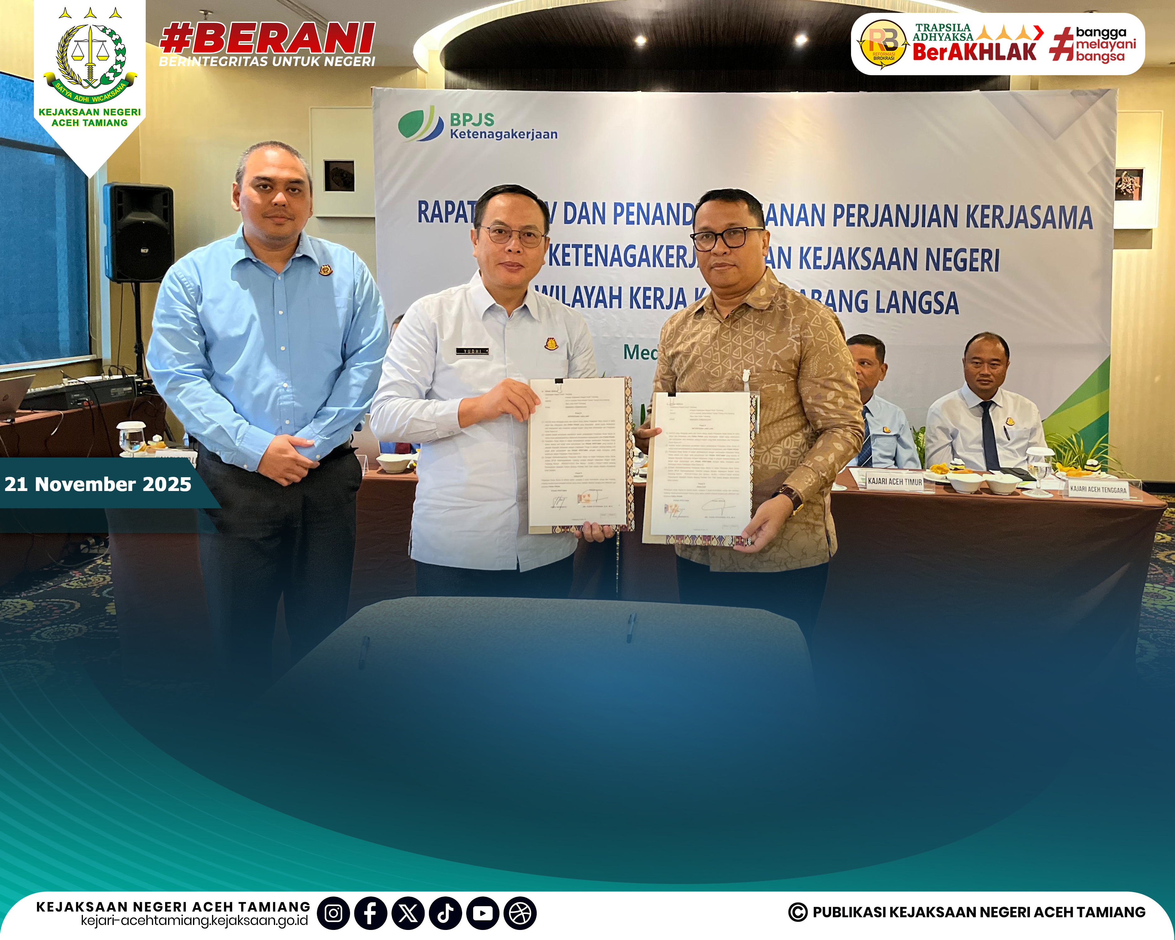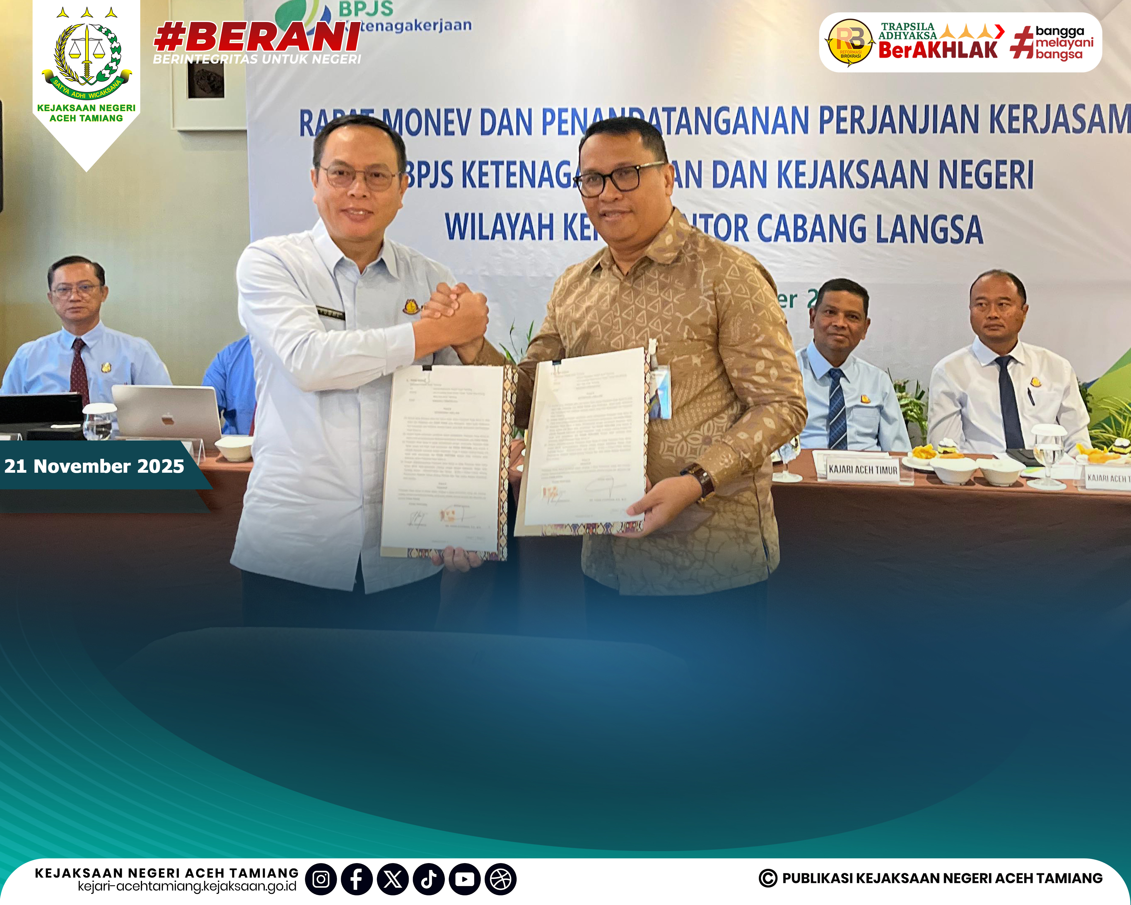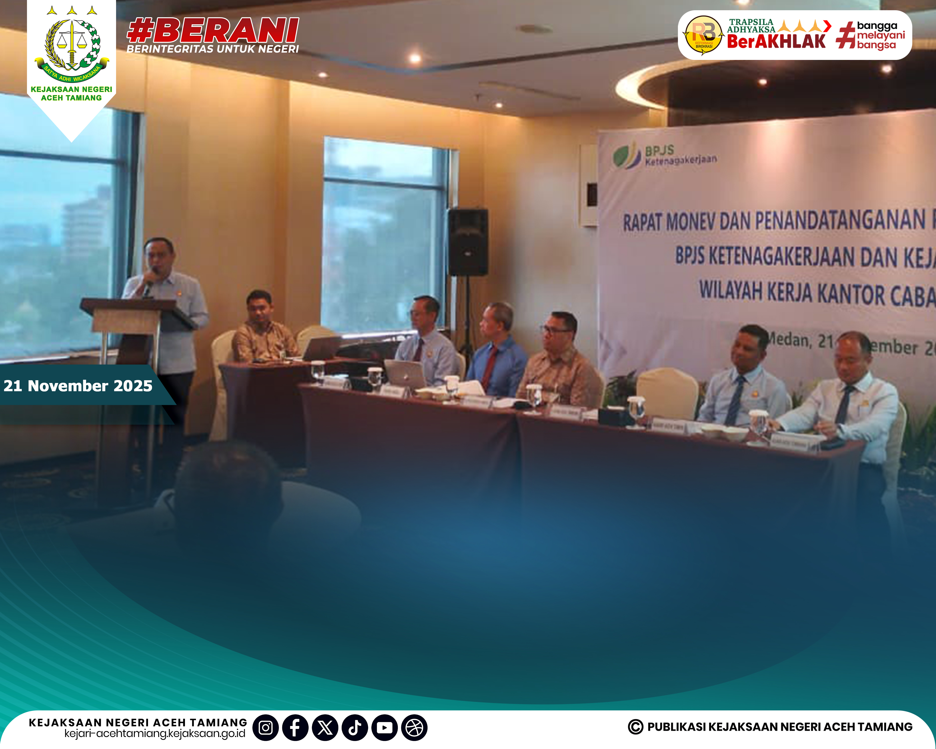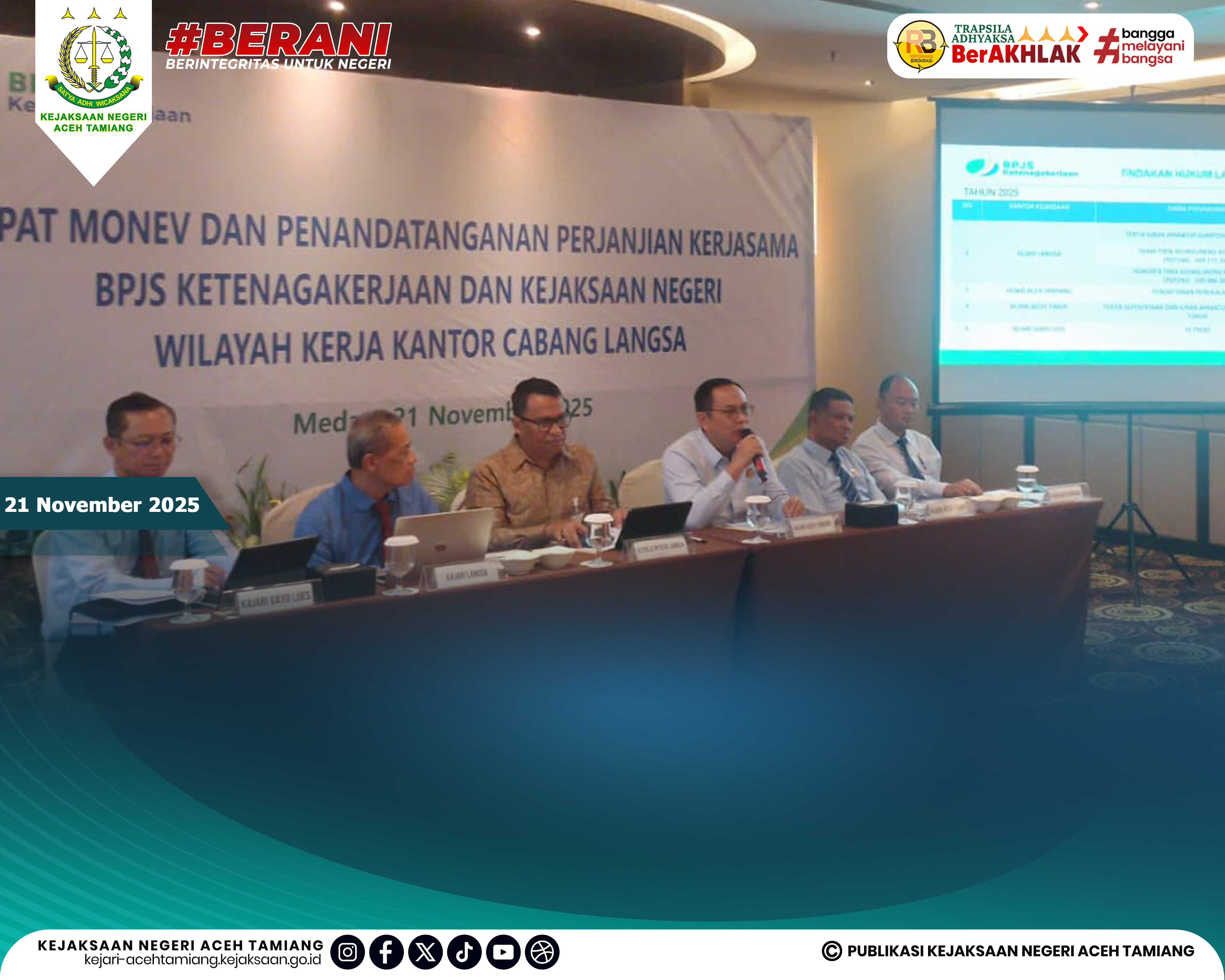 [Jumat, 21 November 2025] Kepala Kejaksaan Negeri Aceh Tamiang, Bapak Dr. Yudhi Syufriadi, S.H.,M.H. didampingi Kepala Seksi Perdata dan Tata Usaha Negara Kejaksaan Negeri Aceh Tamiang, Bapak Rikhy Khadafy, S.H.,M.H. Menghadiri Rapat Monitoring dan Evaluasi Serta Perpanjangan Perjanjian Kerjasama BPJS Ketenagakerjaan Langsa dan Kejaksaan Negeri di Wilayah Kerja Cabang Langsa di Grand City Hall Medan.