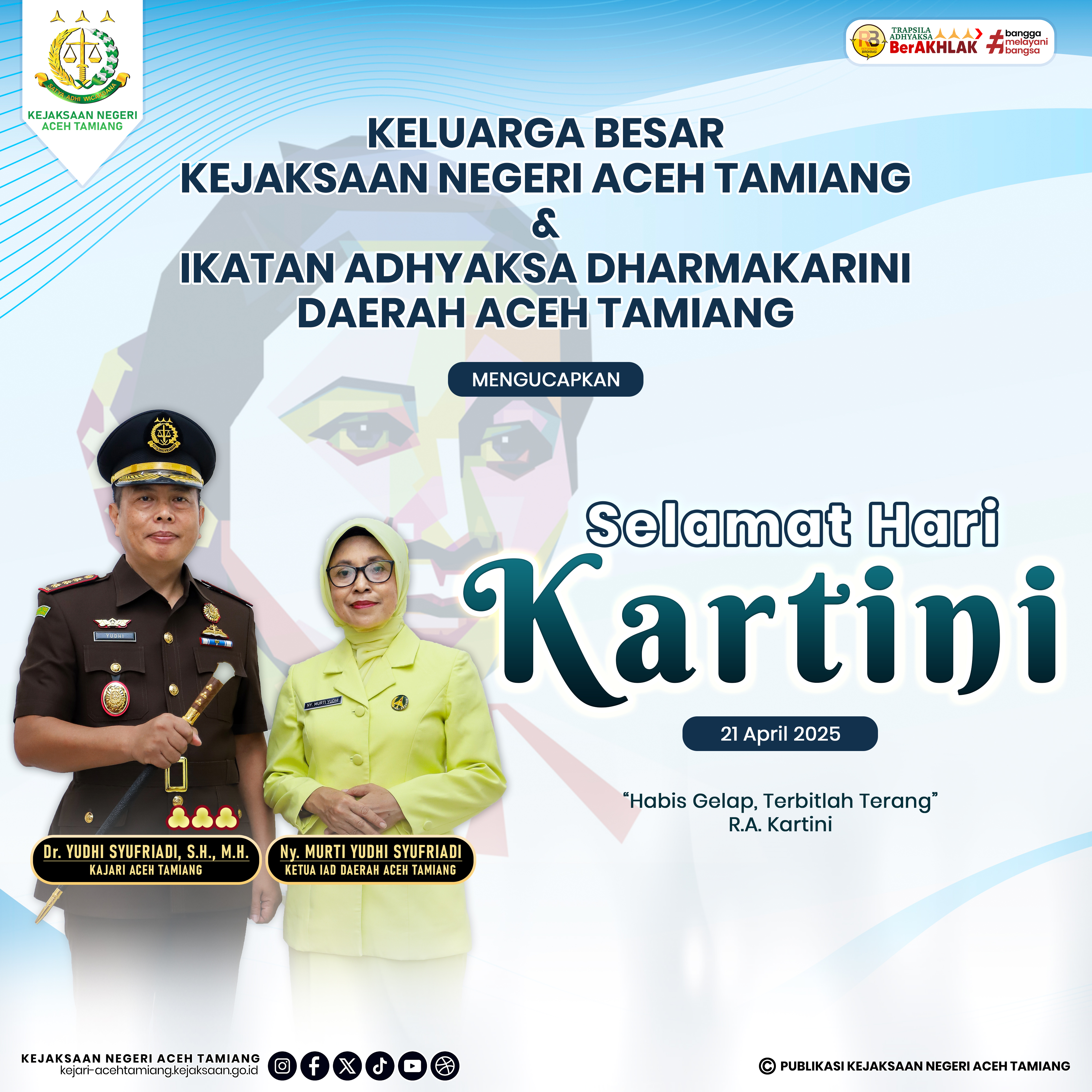 Keluarga Besar Kejaksaan Negeri Aceh Tamiang dan Ikatan Adhyaksa Dharmakarini Daerah Aceh Tamiang Mengucapkan Selamat Hari Kartini (21 April 2025). "Habis Gelap, Terbitlah Terang" R.A. Kartini.