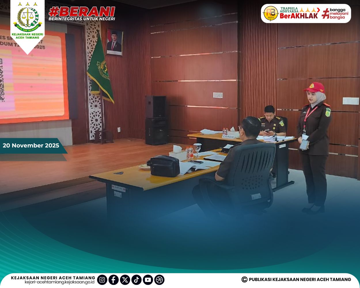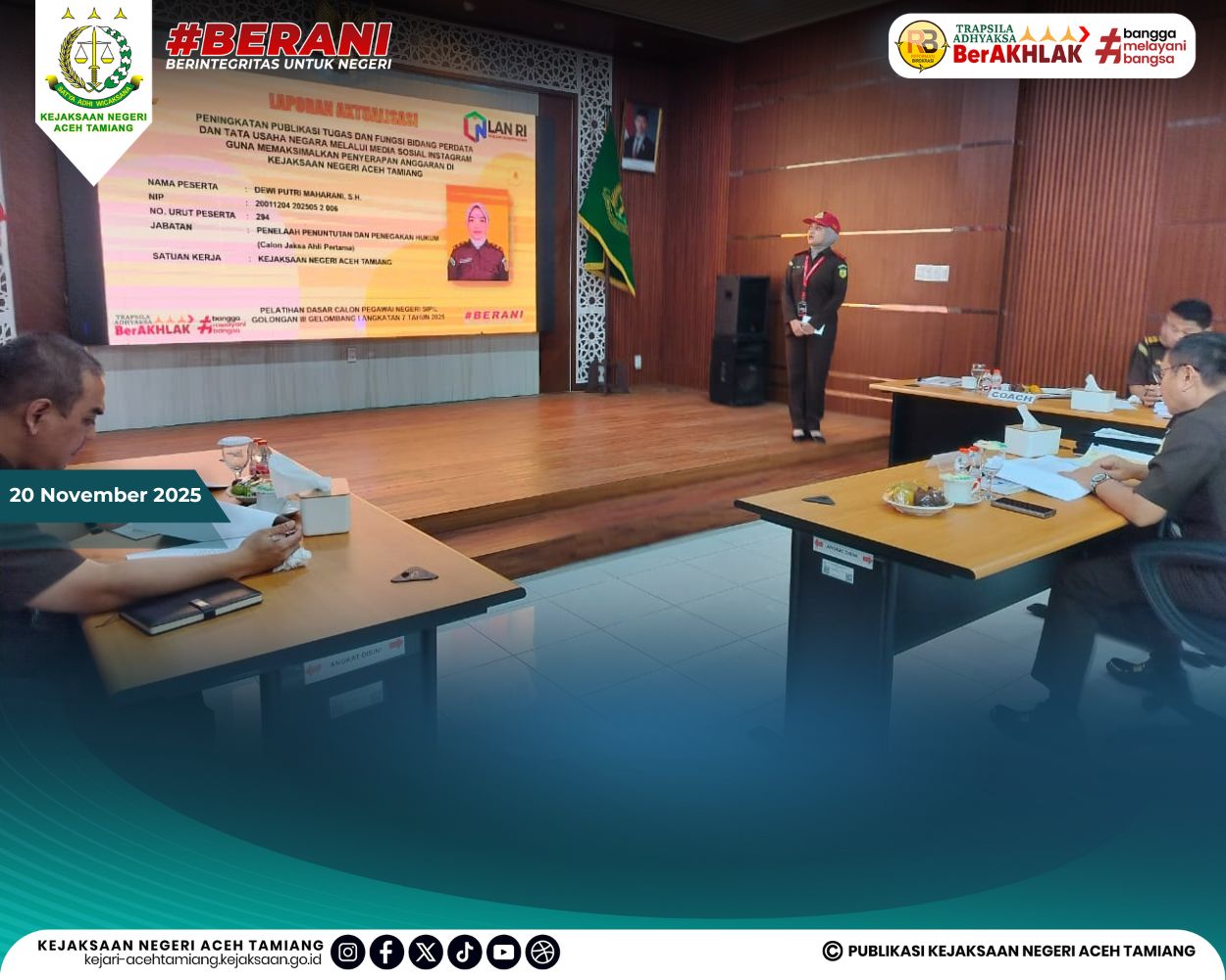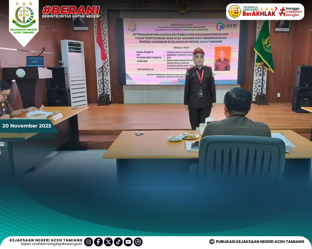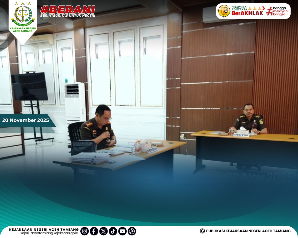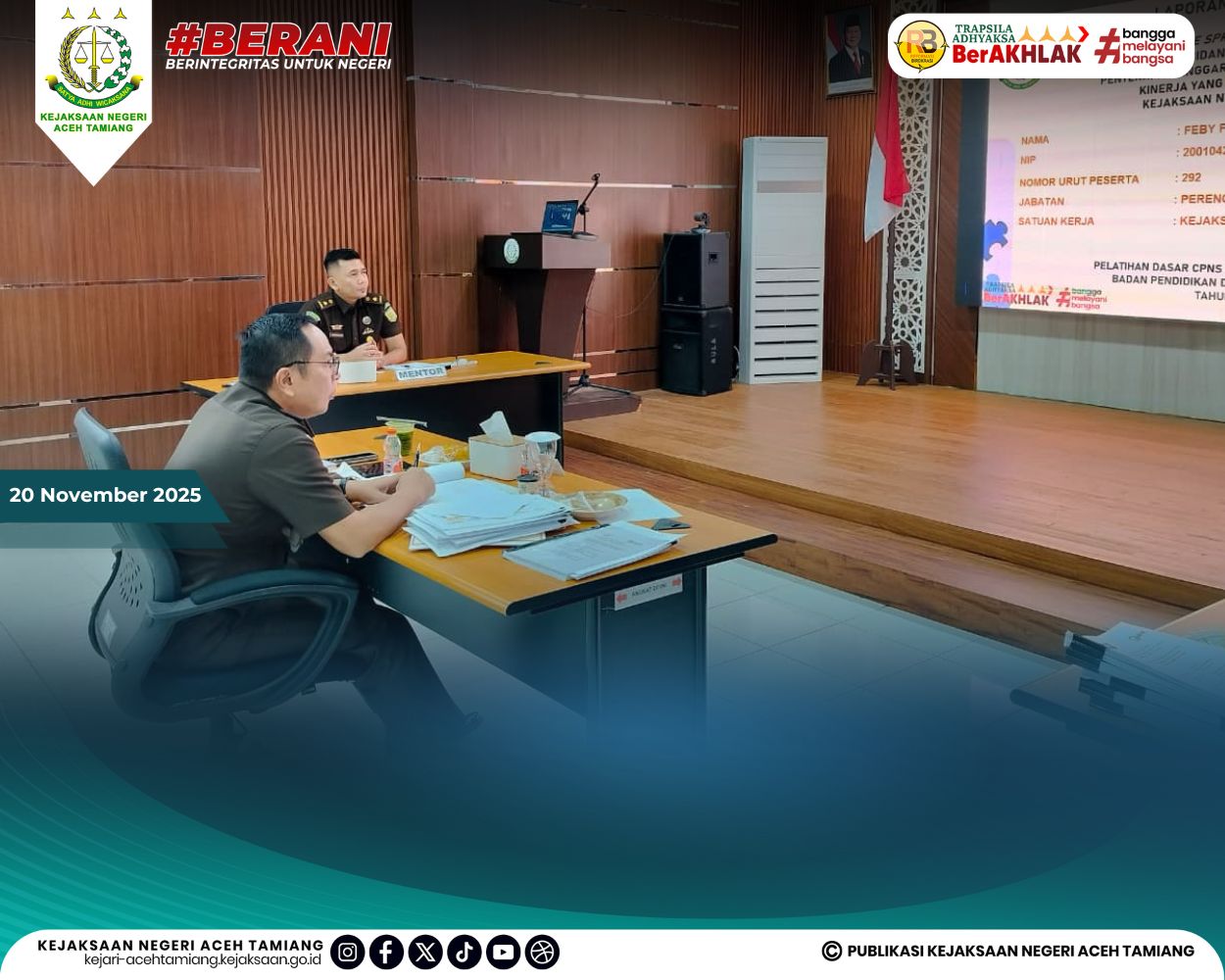 [Kamis, 20 November 2025] Kejaksaan Negeri Aceh Tamiang laksanakan Seminar Evaluasi Aktualisasi terhadap 6 Peserta Pelatihan Dasar CPNS Golongan III Tahun 2025, dengan penguji Bapak Kajari Aceh Tamiang, Dr. Yudhi Syufriadi, S.H., M.H. beserta para Mentor dan Coach Mhd. Hendra Damanik, S.H., M.H. yang bertempat di Aula Kantor Kejaksaan Negeri Aceh Tamiang.