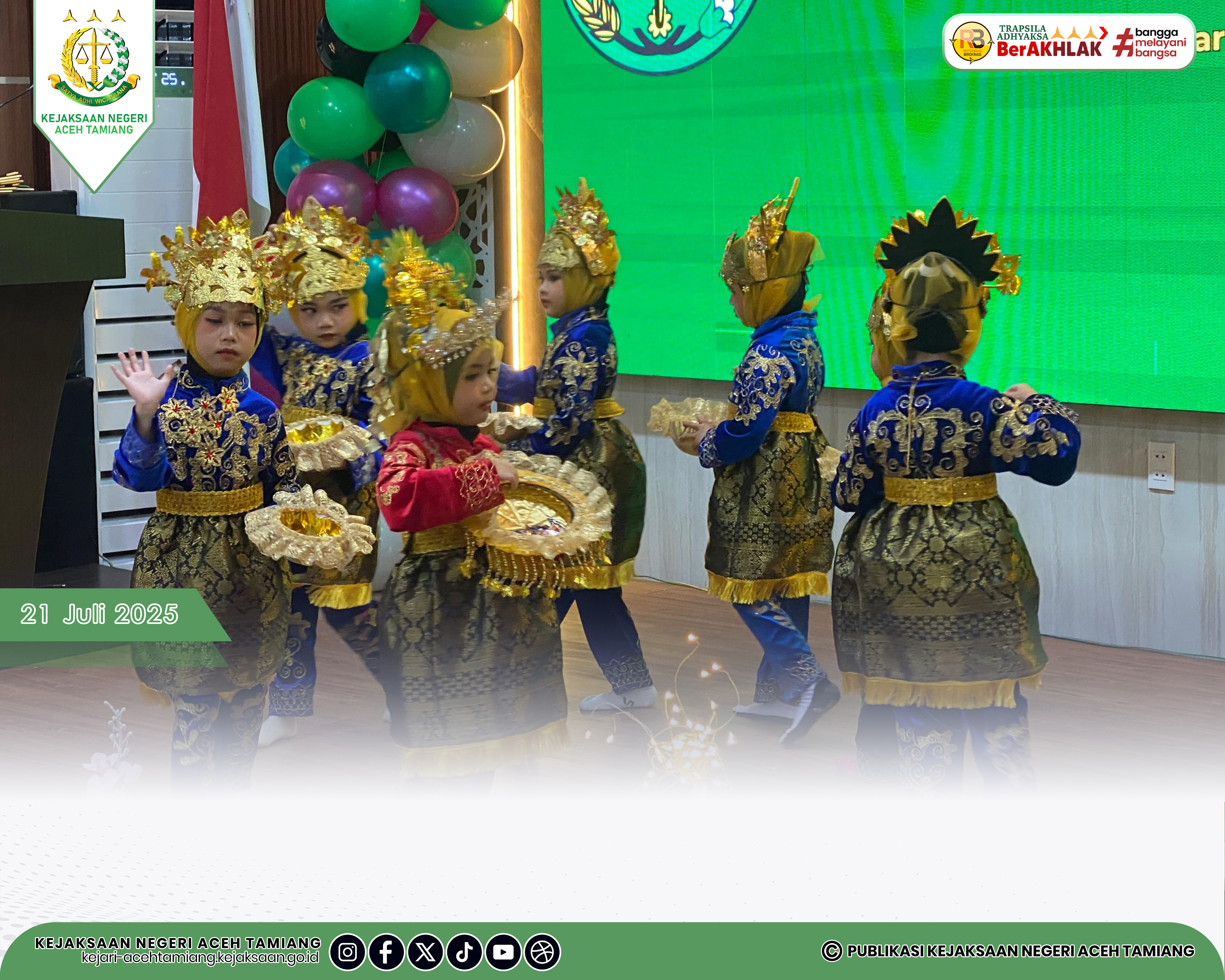 Kemeriahan acara semakin terasa dengan penampilan istimewa dari anak-anak TK Adhyaksa 44 (XLIV) Aceh Tamiang, yang dengan penuh semangat mempersembahkan tarian daerah serta pertunjukan drumband. Penampilan mereka tidak hanya menghibur, tetapi juga memperkuat nilai-nilai budaya dan semangat kebangsaan sejak usia dini.