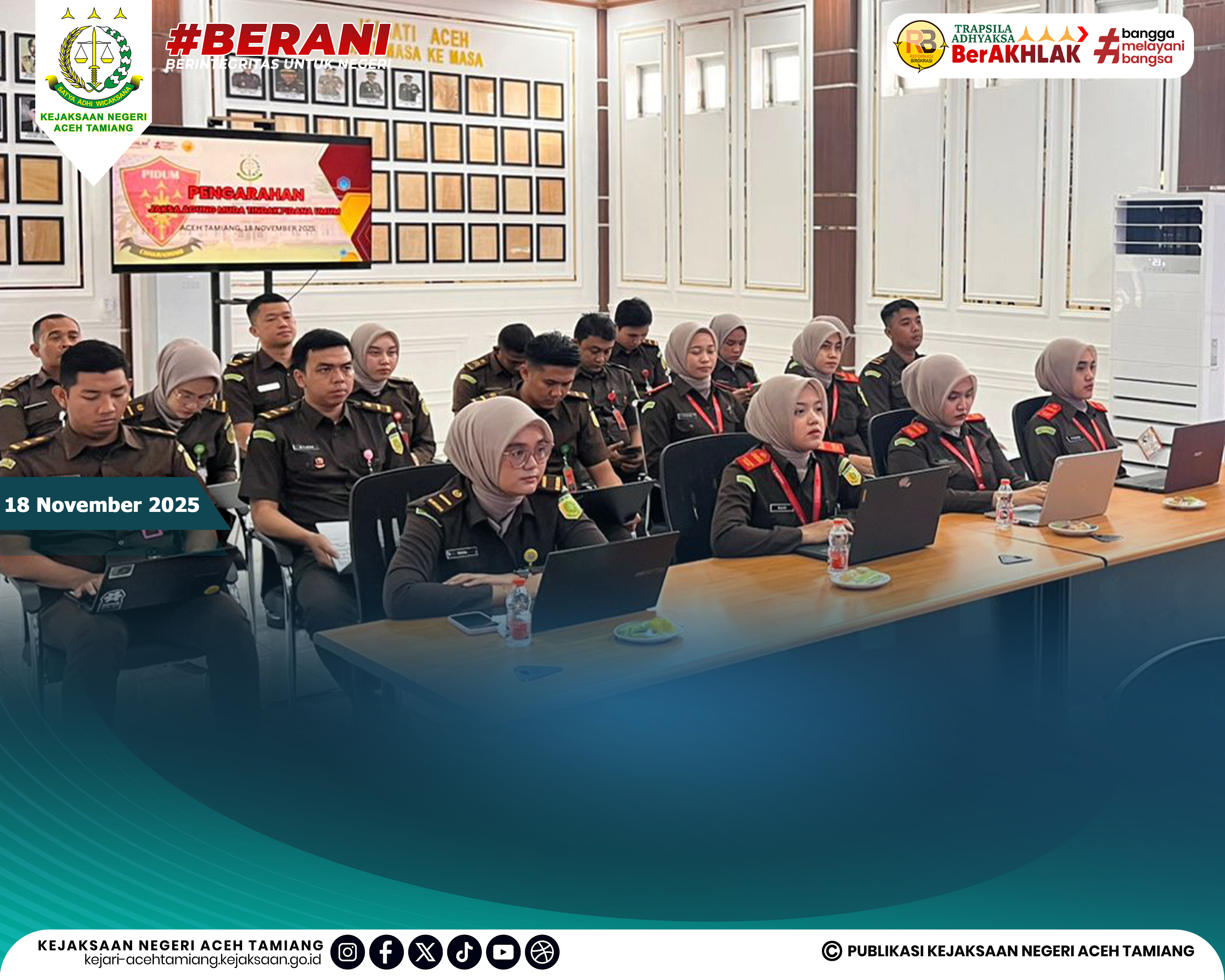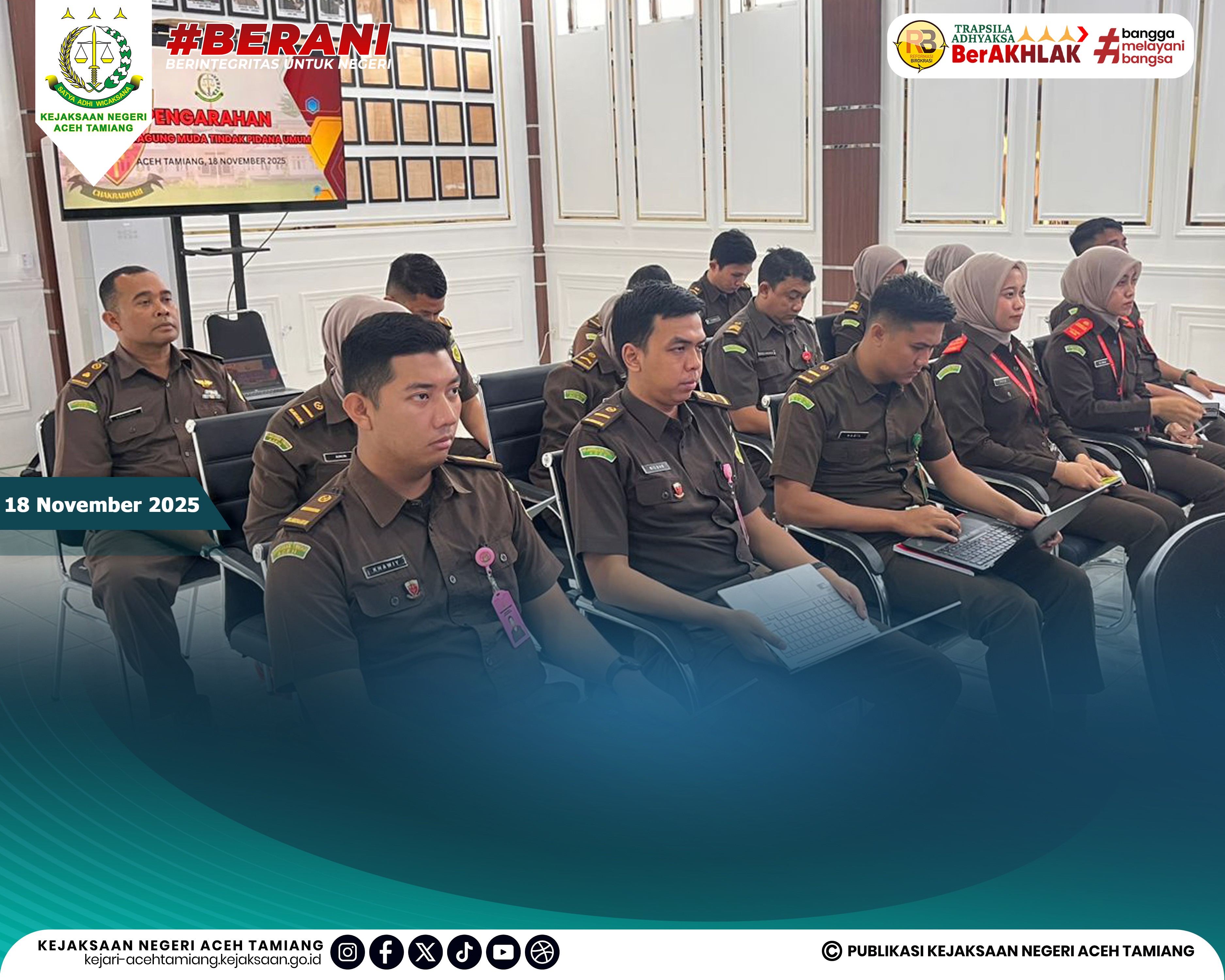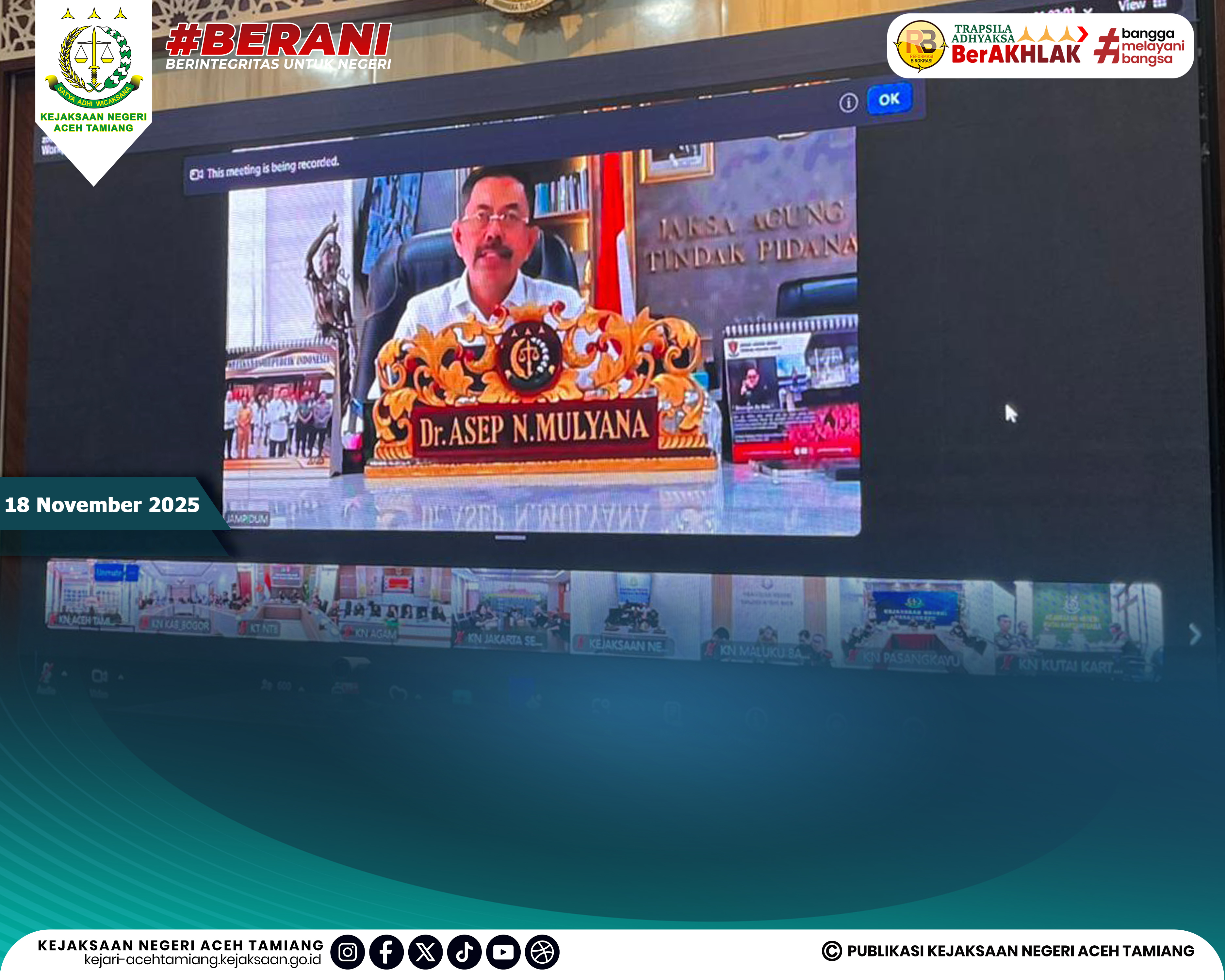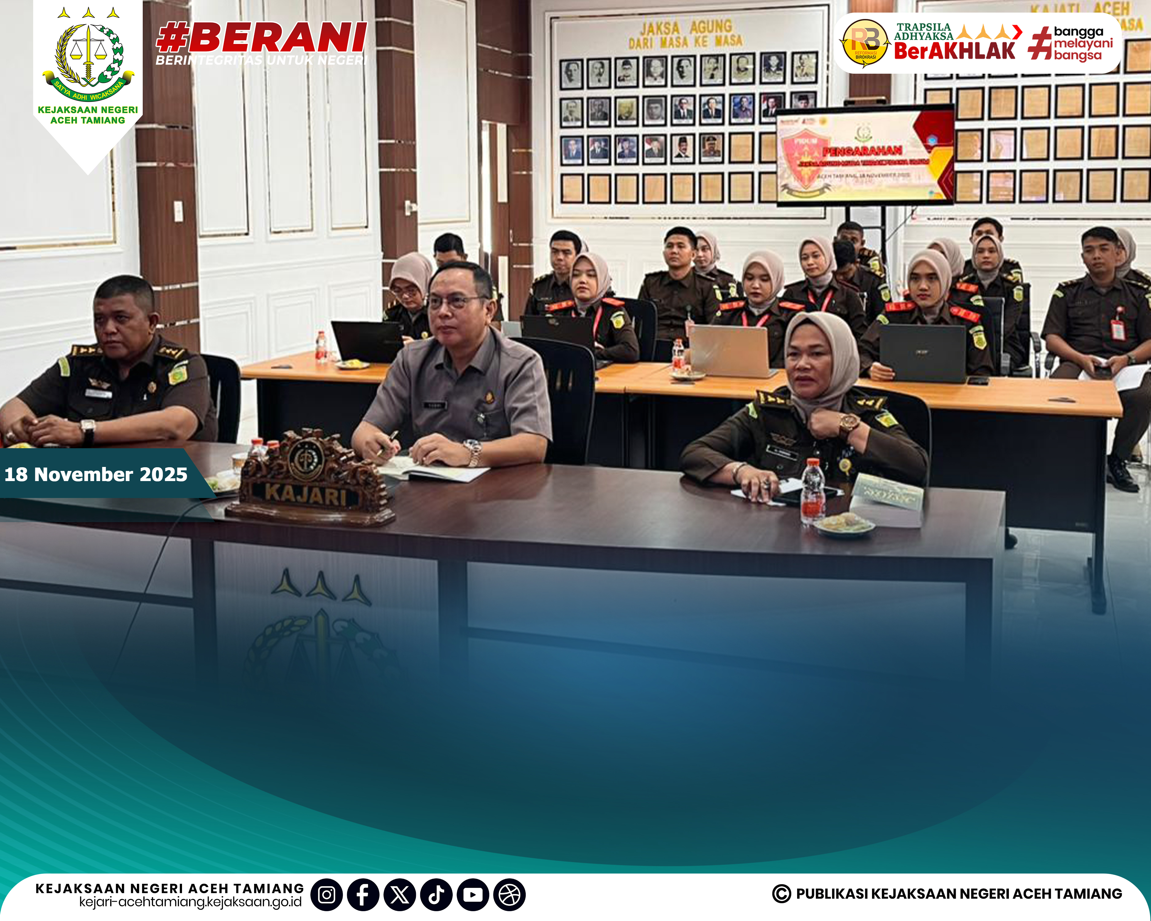 [Selasa, 18 November 2025] Kepala Kejaksaan Negeri Aceh Tamiang Bapak Dr. Yudhi Syufriadi, S.H., M.H. Beserta Para Jaksa Fungsional, Calon Jaksa, dan seluruh Staf Tindak Pidana Umum Kejaksaan Negeri Aceh Tamiang Mengikuti Zoom Meeting Pengarahan Jaksa Agung Muda Tindak Pidana Umum di Aula Kantor Kejaksaan Negeri Aceh Tamiang.