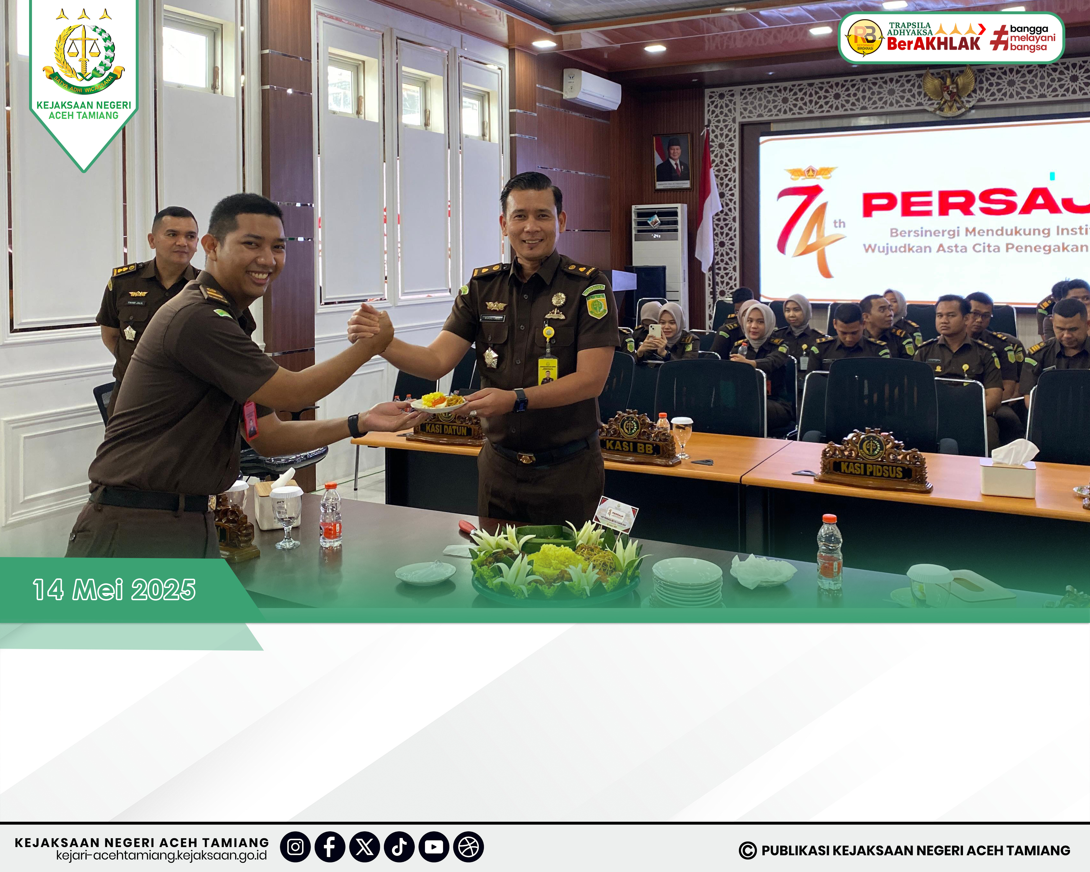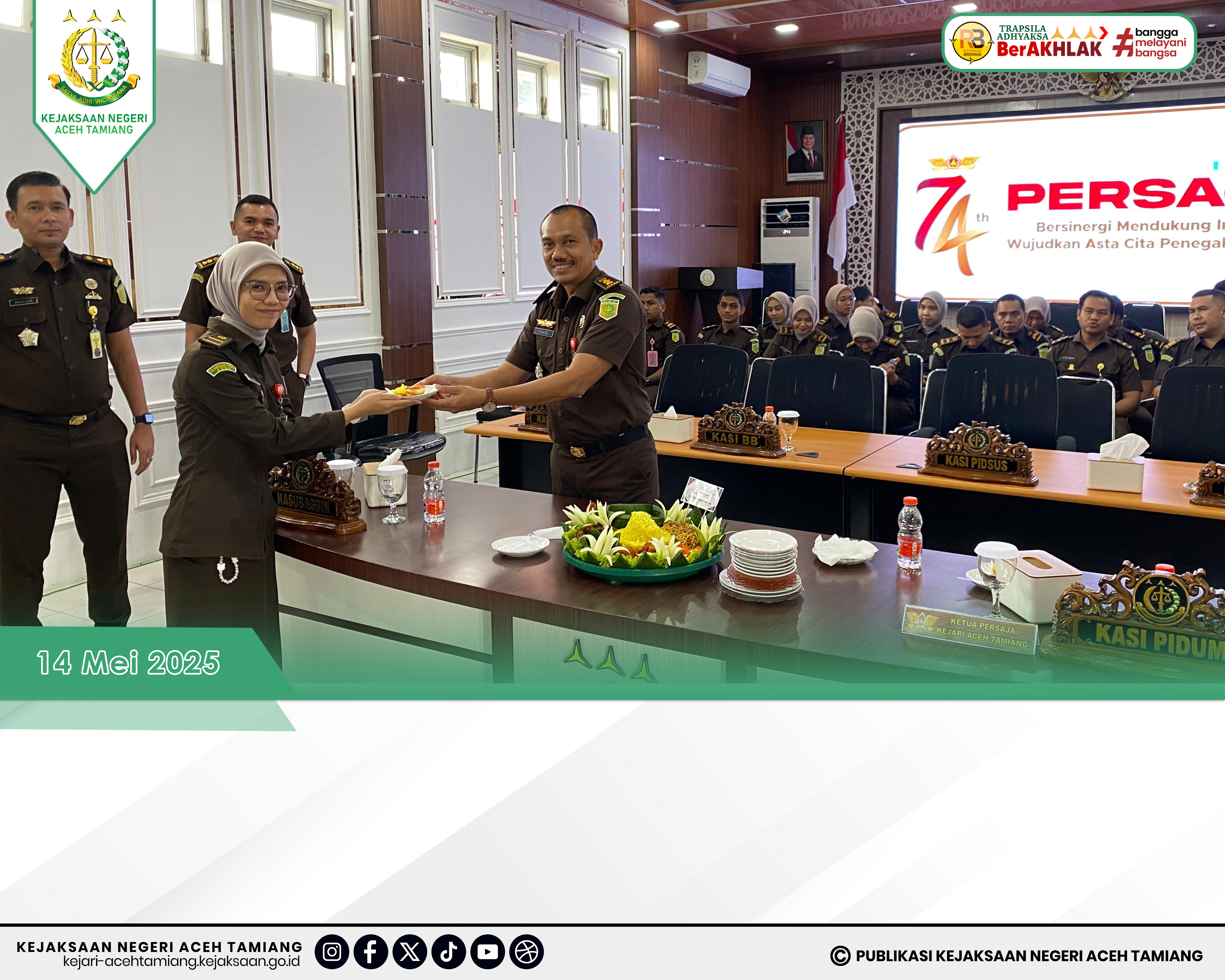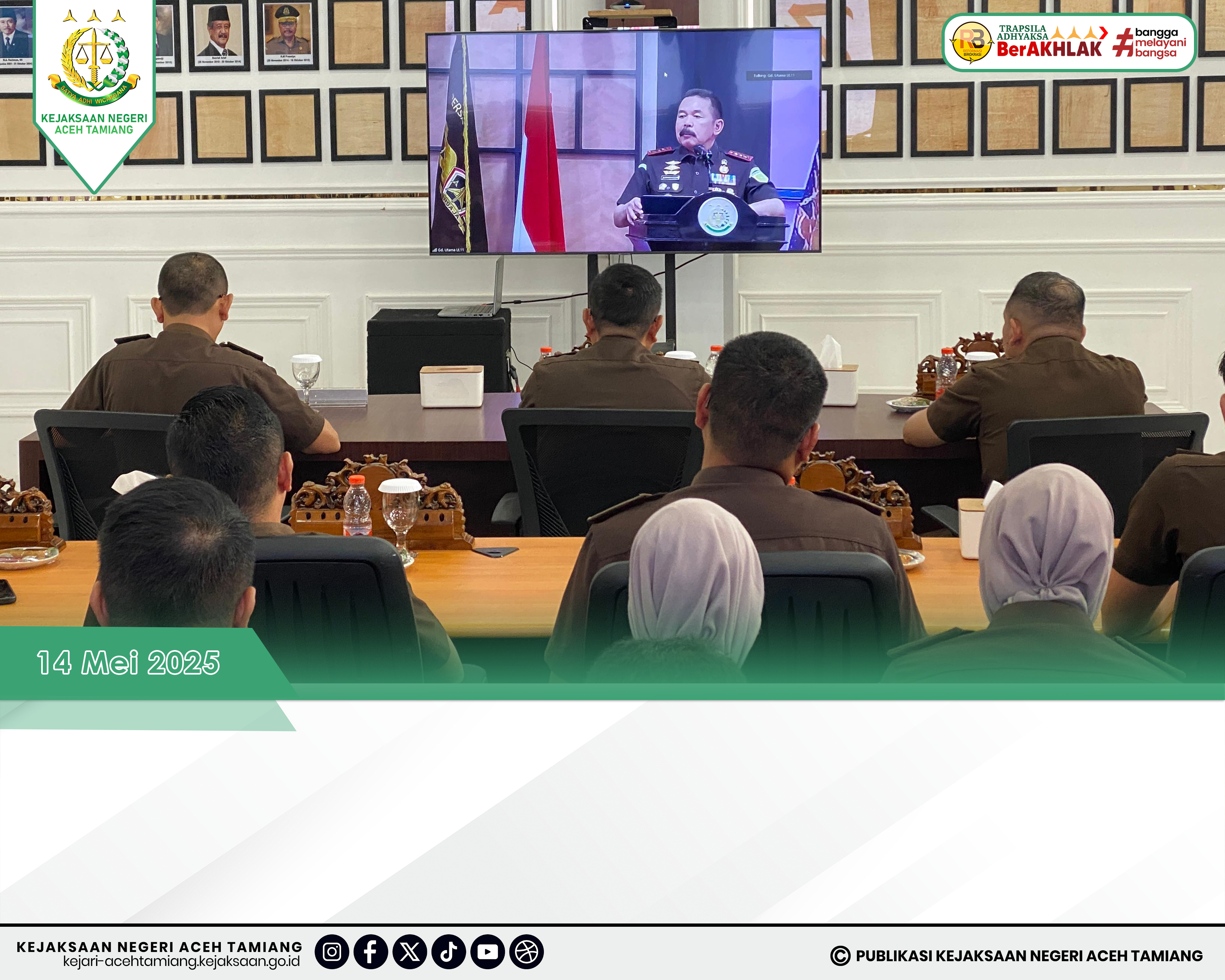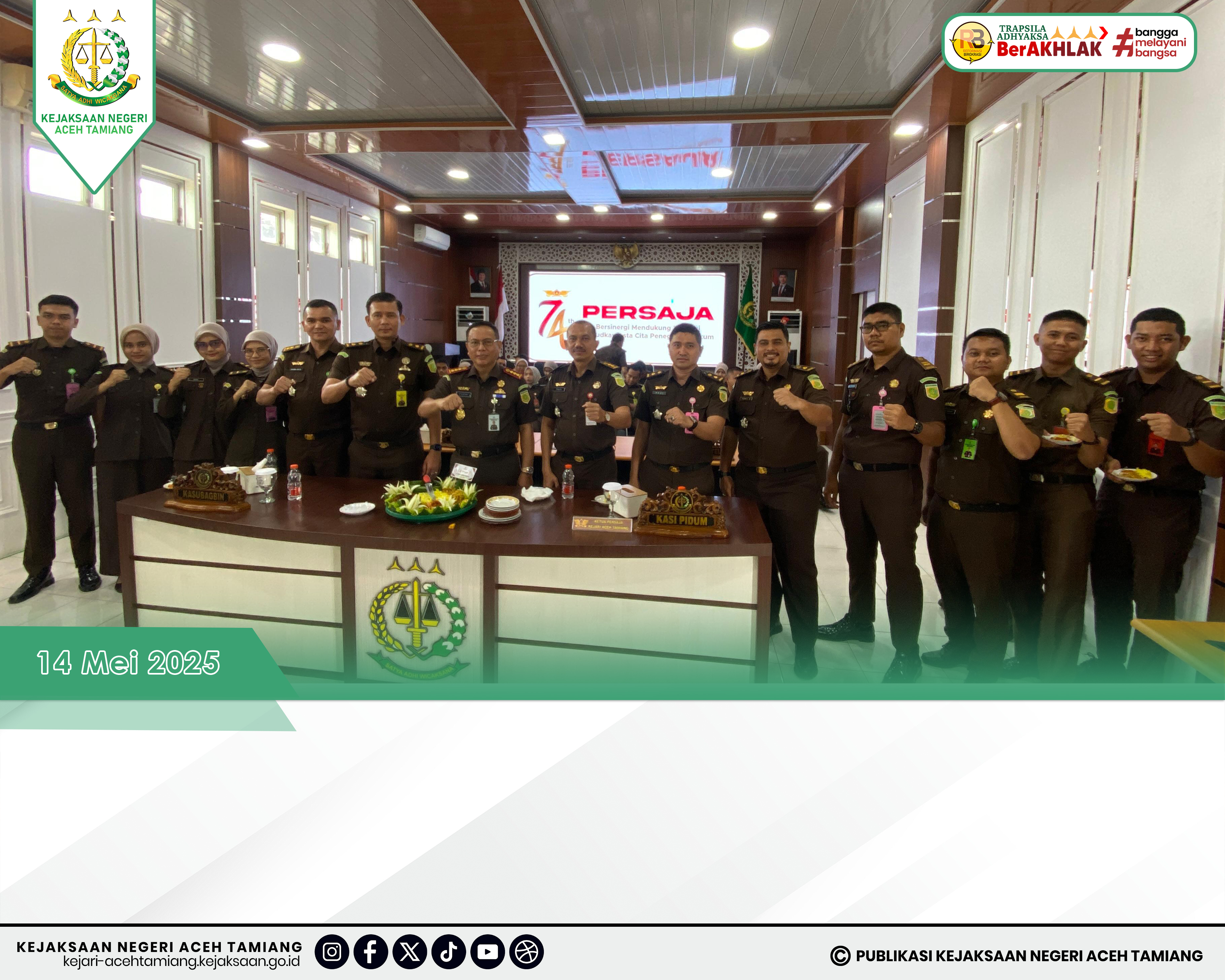 [Rabu, 14 Mei 2025] Kepala Kejaksaan Negeri Aceh Tamiang Bapak Dr. Yudhi Syufriadi, S.H., M.H. Beserta Jajaran Kejaksaan Negeri Aceh Tamiang Zoom Meeting Tasyakuran Peringatan HUT Persaja Ke-73 Tahun 2025 dan dilakukan Pemotongan Tumpeng Secara Serentak di Ruang Aula Kantor Kejaksaan Negeri Aceh Tamiang.